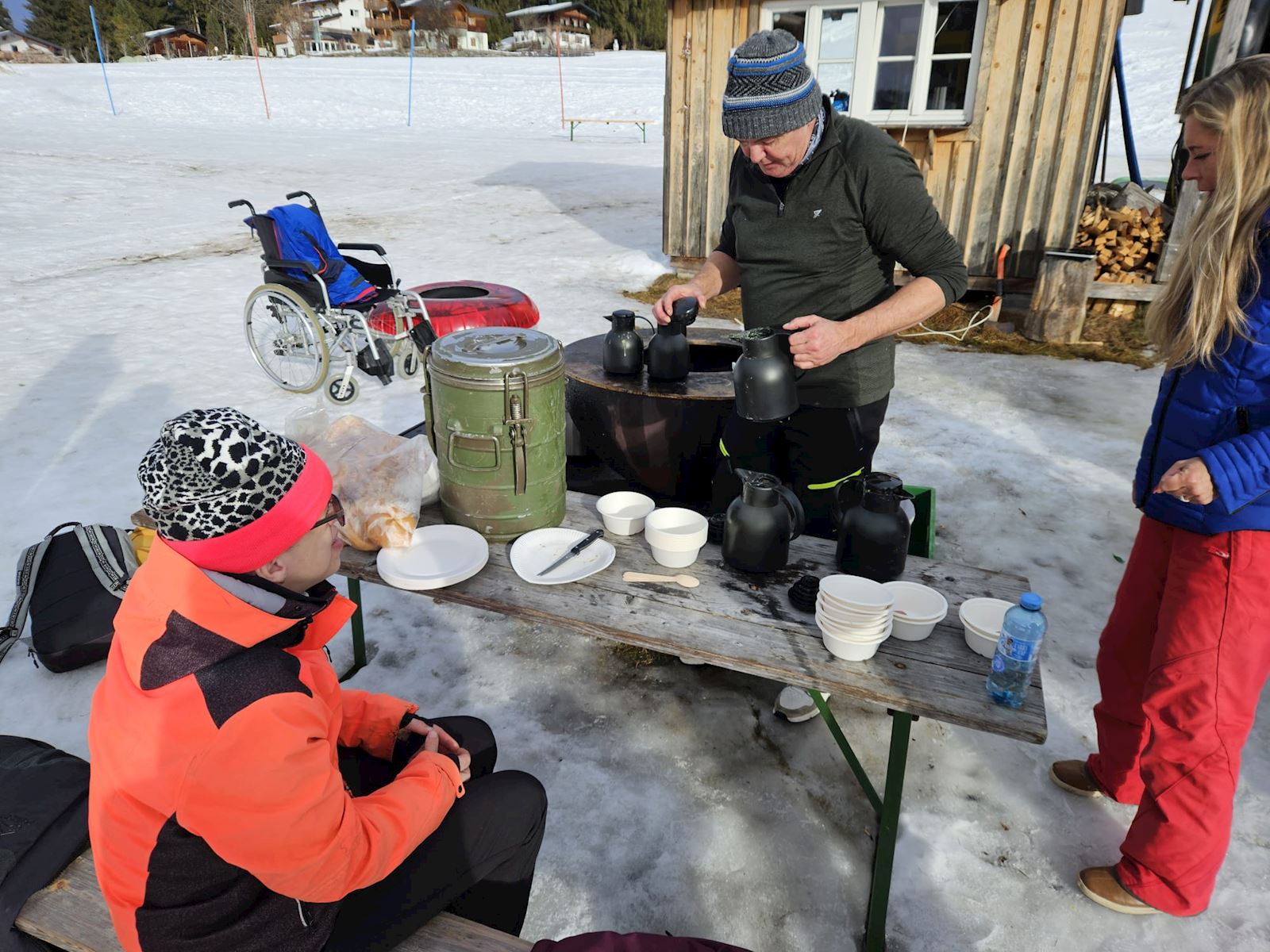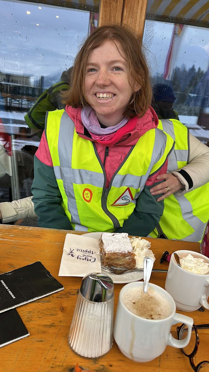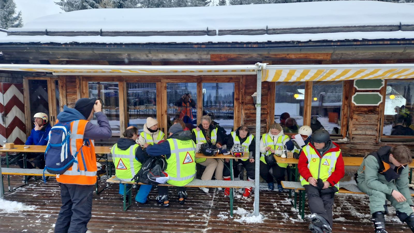 De skiers hadden een grote uitdaging - die moesten in een lekkere sneeuwbui veilig & wel naar beneden zien te komen. Uiteraard was dat ook een hele goede reden om snel een kopje koffie op de piste te nemen. Gelukkig werd het gaandeweg de ochtend lichter & beter en konden we weer verder.