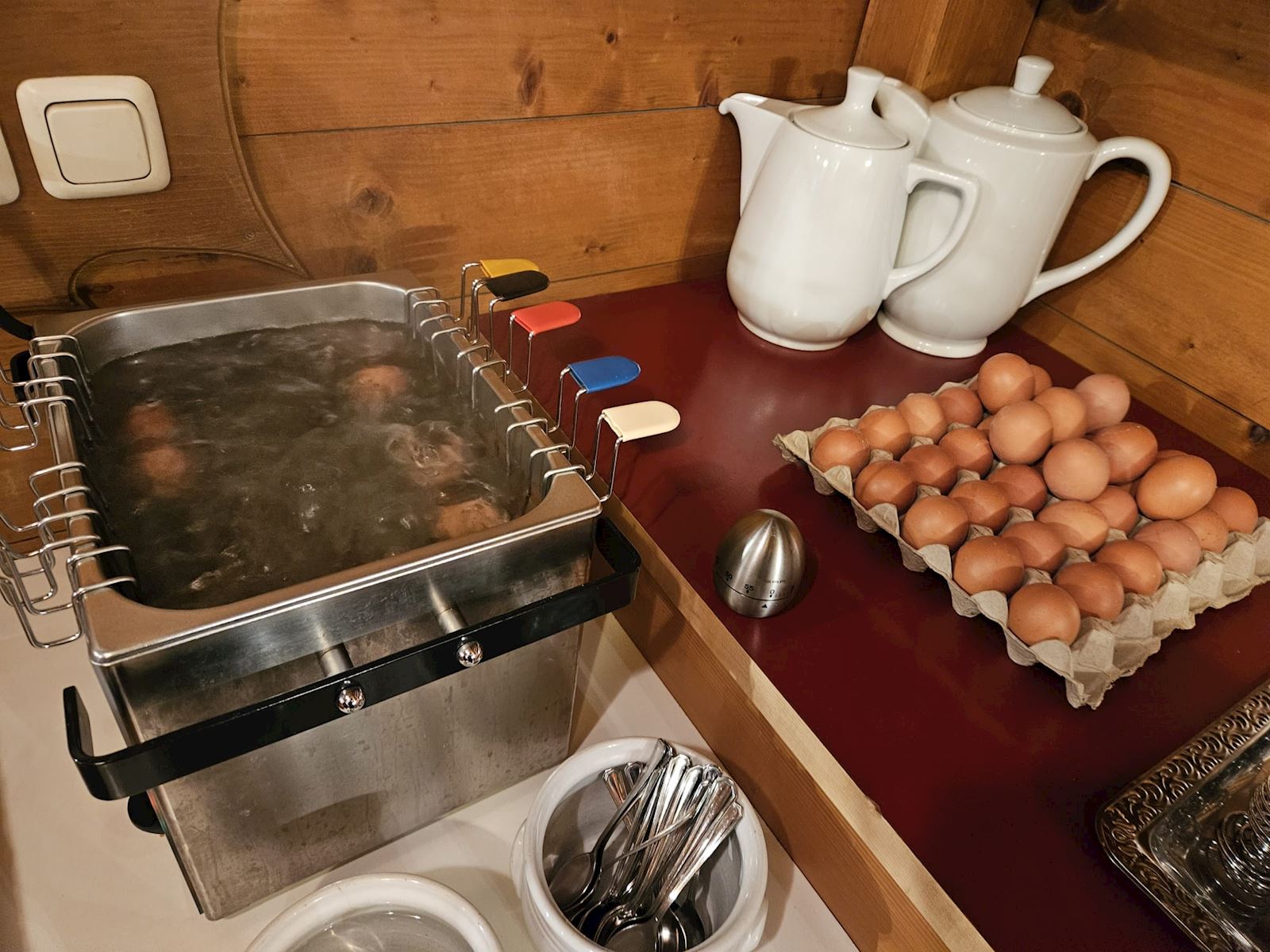 Je ziet ook de foto van eier kook bak - iedereen heeft zo zijn eigen kleuren en krijgt een eigen wekker mee. Grote grap is natuurlijk de wekker van iemand stiekum verder te draaien of juist terug.....dan, krijg je een zacht ei.