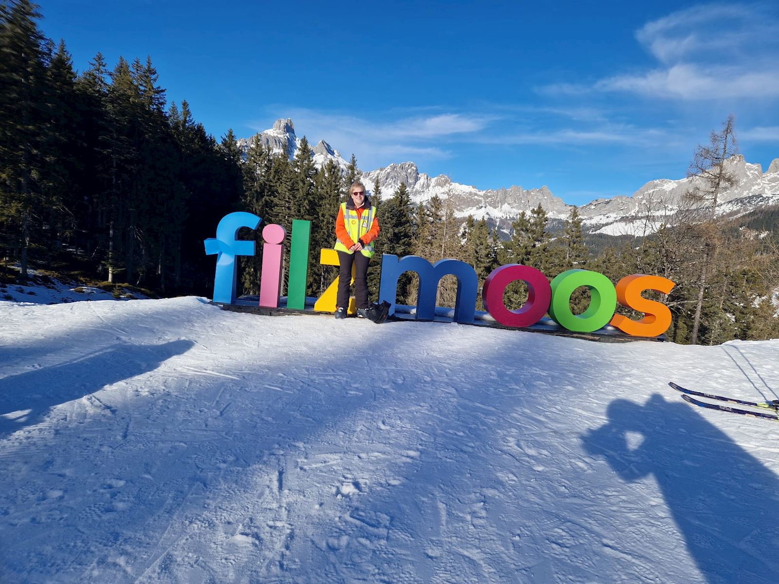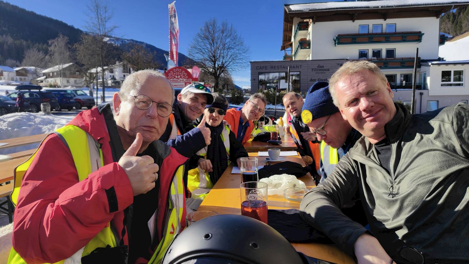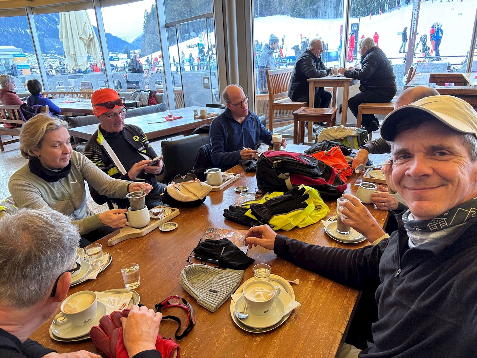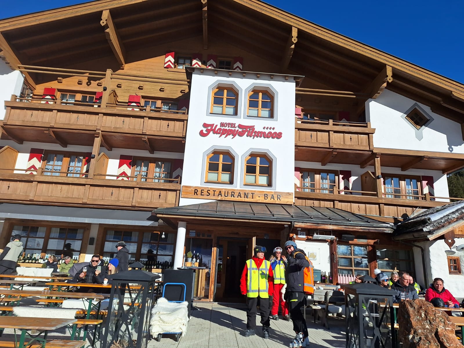Voordat we waren begonnen met het langlaufen het skieen zijn we eerst een kop koffie gaan drinken bij Happy Filmoos. Lekker in de zon.